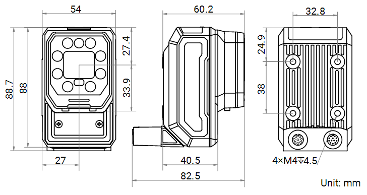 Straight angle: 112.3 mm × 54 mm × 60.2 mm (4.4" × 2.1" × 2.4") Right angle: 88.7 mm × 54 mm × 82.5 mm (3.5" × 2.1" × 3.2")